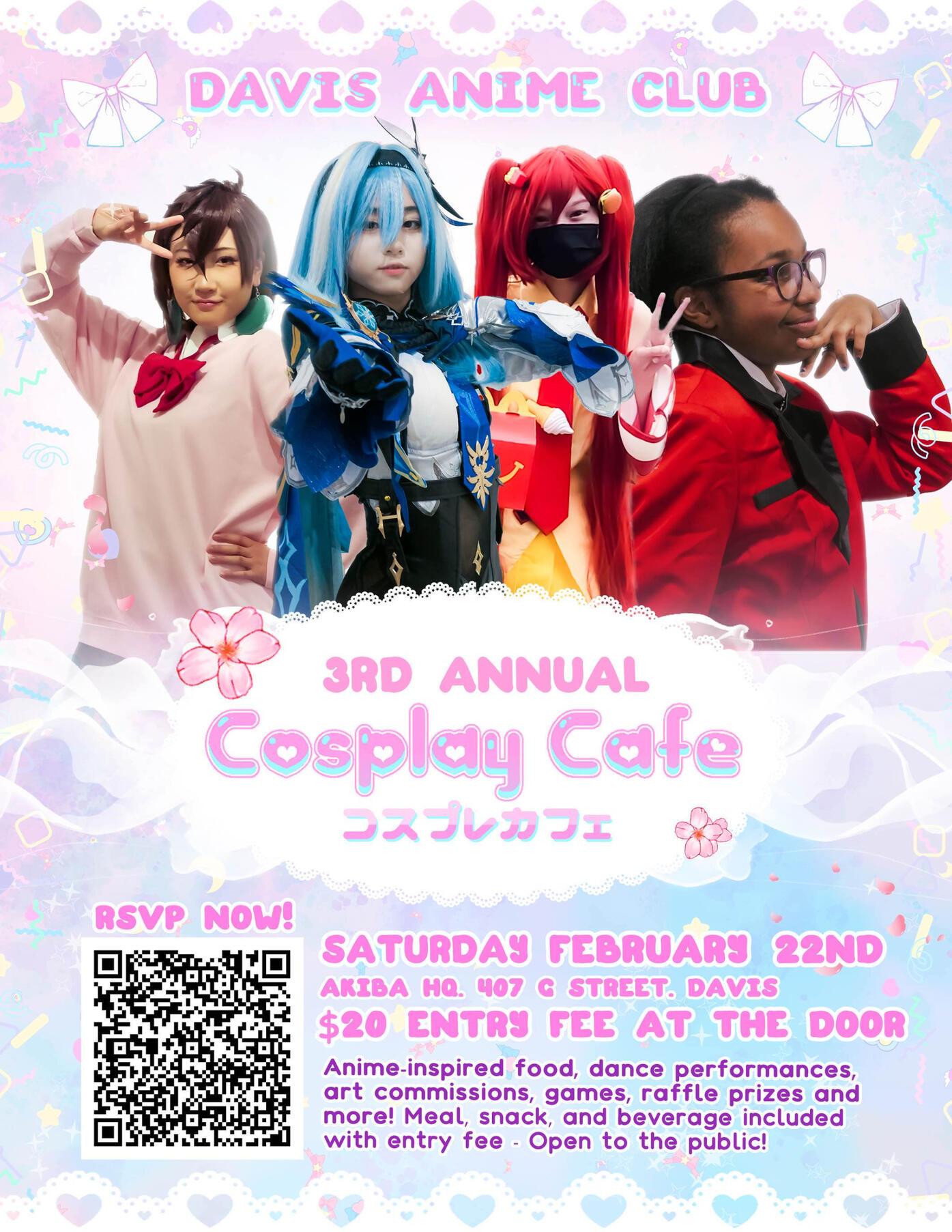 Davis Anime Club’s Cosplay Cafe is an annual event that originated during the 2022-2023 spring quarter at UC Davis.DAC’s Cosplay Cafe features a variety of activities throughout a one hour time slot guests can attend, such as playing games with hosts, eating delicious snacks prepared by a food preparation team, and enjoying dances performed by cosplayers and hosts.Location: Akiba HQ - 407 G St suite 1, Davis, CA 95616
