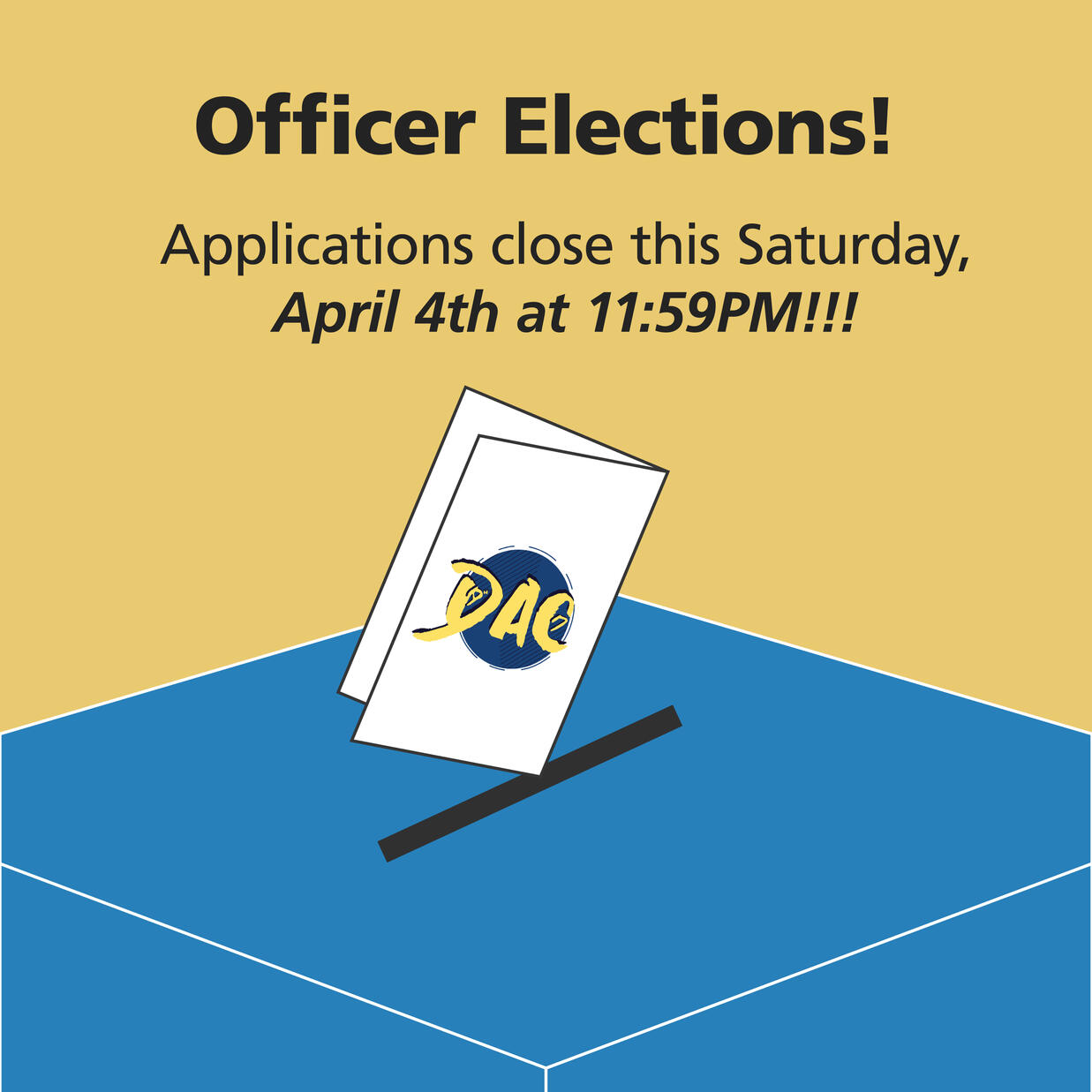 Do you want to be a BIGGER part of DAC and make DAC more fun for the members to have a good time?Many current officers will be graduating, but that doesn't mean DAC will end after 33 years!If you would like to be part of running this club, the deadline for applying for an officer position is April 4th at 11:59 PM!Elected positions will be held on Week 2 and applicants will have a short in-person speech (or voice recording of yourself if you're unable to make it!) on both Wednesday and Thursday of Week 2.Link to more information about the positions: Position DescriptionLink to Elected Positions: Elected ApplicationLink to Non-elected Positions:Non-Elected Application